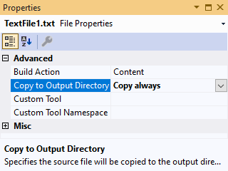 For this example I created a text file, TextFile1.txt, in my test projects’ root dir and set its Copy to Output Directory property to Copy always.
